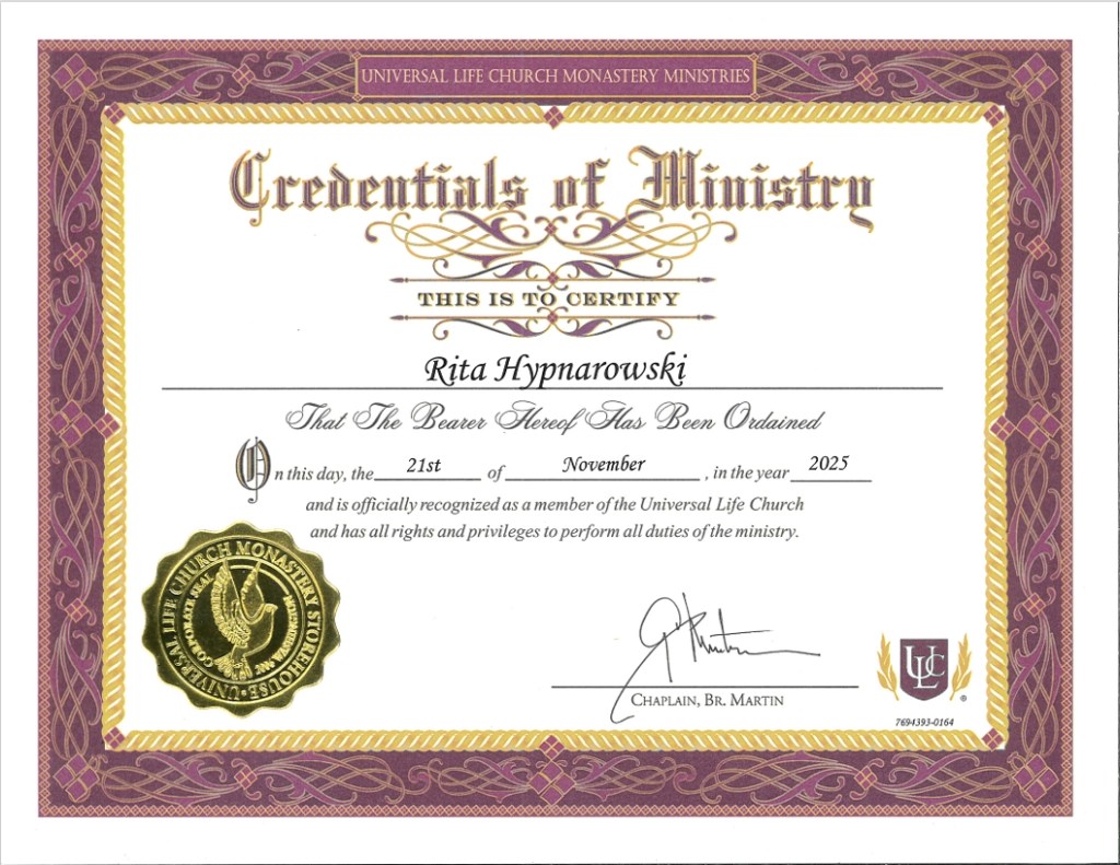 You can reach me at ritaanyanara@gmail.com or by filling out the Contact form below. I am an ordained minister licensed in California, and I attend seminary courses at Bayside University in Granite Bay, California.